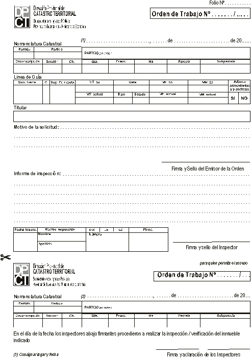 1) La determinación de la valuación tramitará por Orden de trabajo que deberá generar el Departamento Zona correspondiente. Esa orden deberá ser elevada a la Dirección de Régimen Catastral, para su consideración, con los formularios de avalúo antecedentes. 2) La Dirección de Régimen Catastral remitirá las Ordenes de Trabajo, que entienda procedentes, a la Dirección de Catastro Económico. 3) La inspección siempre deberá realizarse con los antecedentes valuatorios del inmueble, en caso de poseerlos. 4) Concluido el relevamiento deberá completarse la orden de trabajo y el acta de inspección, que conforman un solo instrumento –de acuerdo al modelo que como Anexo I forma parte de la presente. 5) La Orden de Trabajo, en lo concerniente al acta de inspección, también deberá ser suscripta por la persona que permite el acceso al inmueble o en su defecto hacer constar sus datos personales. Se entregará a quien permite el acceso, la parte inferior ("para quien permite el acceso") del formulario que integra la Orden de Trabajo y el acta de inspección. 6) Confeccionados -en gabinete- los formularios de avalúo (por duplicado) y el informe técnico, correspondientes a la inspección, se deberá completar la cédula de notificación que como Anexo II forma parte de la presente. En todos los casos deberá indicarse el Destino del edificio y completarse en el Rubro 3 de los formularios -"Estado de Conservación"-, las características del "Puntaje de Reciclado", testando el casillero "SUMA DE PUNTOS" cuando no se llegue al puntaje previsto por la normativa para considerar reciclado un edificio y consignarse la fecha del relevamiento. 7) Con la cédula de notificación (Anexo II) y un juego de formularios de avalúo se procederá a notificar la nueva determinación valuatoria. 8) Cumplida la notificación; la Orden de trabajo, la cédula, un juego de formularios de avalúo y el informe técnico serán remitidos con nota del Jefe de Departamento o responsable (avalando el relevamiento), a la Dirección de Catastro Económico, para que por su intermedio se gire a la Dirección de Régimen Catastral. 9) Luego el Departamento Zona tomará conocimiento de la nueva valuación fiscal y mandará a microfilmar la orden de trabajo/acta de inspección, los formularios de avalúo, el informe técnico, la nota del jefe del Departamento y la cédula de notificación.
