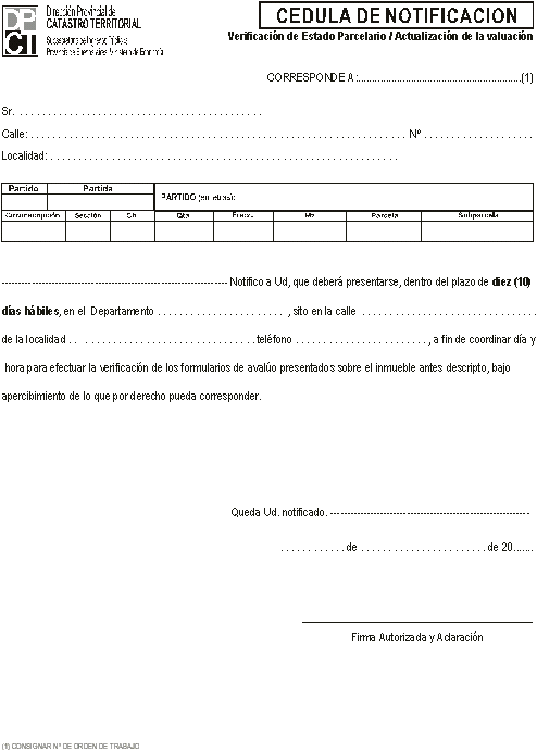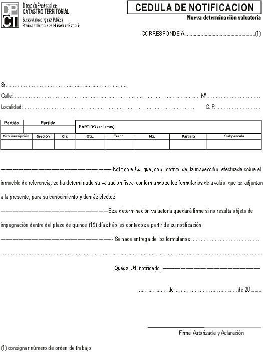 D) FORMA DE LAS NOTIFICACIONES. Las notificaciones, en cuanto a su forma, deberán contener los recaudos previstos en el Anexo VI, que forma parte de la presente. Como Anexo VI-1 se ilustran los modelos de notificación personal. El formulario de cédula indicado como Anexo VI-2- será utilizado en todos los casos no previstos por esta circular. Regístrese, circúlese. Cumplido archívese. DIRECCION PROVINCIAL DE CATASTRO TERRITORIAL. FDO: Zunilda Cristina López.