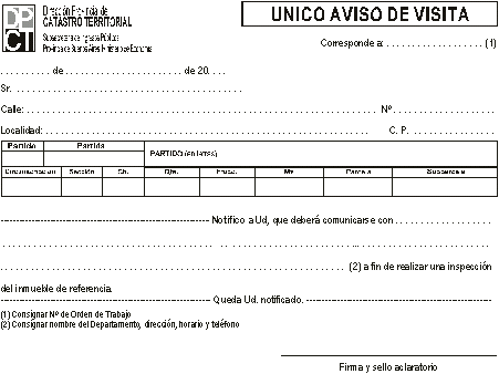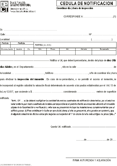1) El inspector concurrirá al lugar donde se encuentra ubicado el inmueble objeto del relevamiento y ante la imposibilidad de acceder al mismo dejará un Aviso de Visita, conforme modelo que como Anexo III integra esta circular, informando al contribuyente que deberá concurrir a la Delegación de Catastro o comunicarse a fin de coordinar día y hora en el que se llevará a cabo la inspección. Consignar número de Teléfono y domicilio de la Delegación o Departamento. En esta instancia también deberá confeccionarse el Formulario 917 aprobado por Disposición 4.222/02; 2) Transcurridos cinco (5) días, desde la comunicación indicada en el punto 1, sin obtener respuesta alguna, se deberá caratular expediente y confeccionar la cédula de intimación conforme al modelo adjunto como Anexo IV (en la que se informa la cantidad de metros estimados y la valuación fiscal determinada), que se remitirá al domicilio fiscal que conste en la base de datos; si no lo hubiere la notificación deberá realizarse en el lugar donde se encuentra ubicado el inmueble y en los términos del Art. 65°, párrafo segundo, del Decreto Ley 7.647/70; 3) Vencido el plazo otorgado mediante cédula de intimación (10 días), sin obtener respuesta del contribuyente se deberá agregar el formulario 917 –conformado en la oportunidad prevista en el punto 1)- y una nota del Jefe de Departamento correspondiente, por la que presta su conformidad con la determinación valuatoria realizada en los términos del Artículo 13° de la Ley 12.837; 4) Cumplido lo expuesto en el punto 3° la actuación se girará al Departamento Zona correspondiente para su incorporación al registro catastral. 5) El Departamento Zona tomará conocimiento de la nueva valuación fiscal y mandará a microfilmar la orden de trabajo, el formulario de avalúo, la nota del jefe del Departamento y la cédula notificada. ARTÍCULO 13° DE LA LEY 12.837: "... a) Se deberá multiplicar la cantidad de metros cuadrados de edificación detectados; por el máximo valor unitario por metro cuadrado, de la tabla correspondiente al partido donde se encuentra ubicado el inmueble objeto de la fiscalización o verificación, valor que se presumirá incluye las instalaciones complementarias que el edificio posea; b) Para establecer la fecha en que debió darse el alta, se presumirá, salvo prueba en contrario, que la vigencia catastral de dichas obras y/o mejoras corresponde al 1º de enero del año más antiguo no prescripto..."