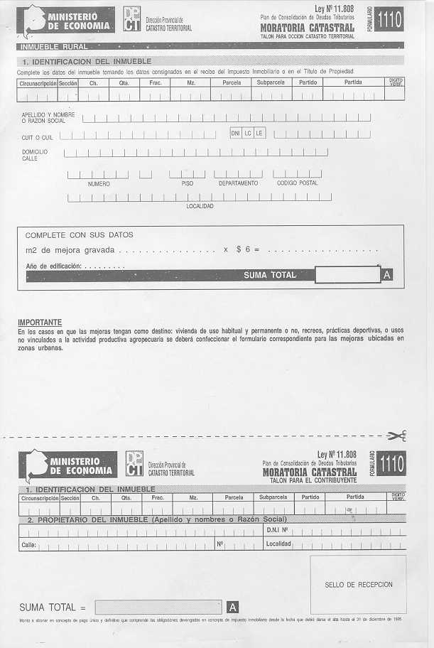 Artículo 1°: Extender el uso de los formularios aprobados por la Disposición 9602/00, para los casos de mejoras existentes a partir del 1/1/2000, detectados por los operativos efectuados por esta Dirección Provincial y que no hayan sido declaradas por los contribuyentes. Artículo 2°: La extensión dispuesta por el artículo 1° no implica ampliar los beneficios del Decreto 3621/00 para las mejoras existentes a partir del 1 de enero de 2000- Artículo 3°: Regístrese, dése al Boletín Oficial para su publicación. Comuníquese, circúlese. Cumplido, archívese.-
