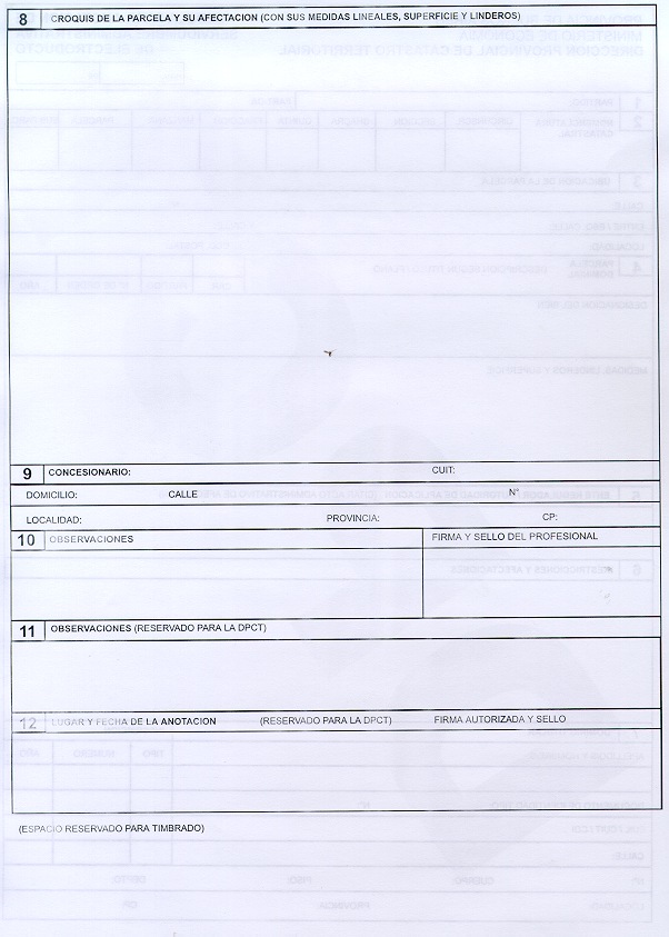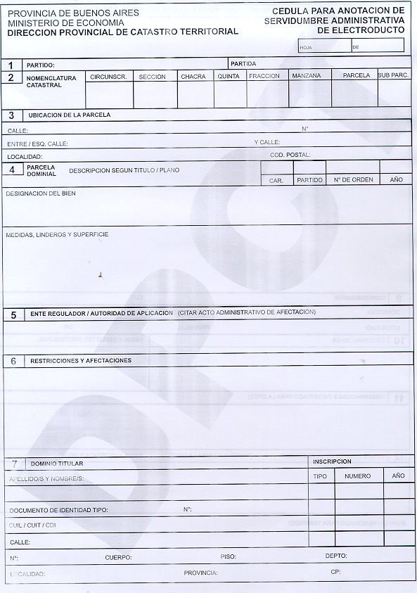 Artículo 3°: La Cédula para anotación de servidumbre administrativa de electroducto se anexará a la Cédula Catastral registrada o a las constancias preexistentes y formará parte del registro parcelario definido por el artículo 17° de la Ley 10.707, debiendo integrar toda publicidad catastral. Artículo 4°: Aprobar el formulario de "Cédula para anotación de servidumbre administrativa de electroducto" que como Anexo I pasa a formar parte integrante de la presente. Artículo 5°: Regístrese, dése al Boletín Oficial para su publicación. Comuníquese, circúlese. Cumplido archívese. DISPOSICIÓN N° 11.977 Fdo: Lic. Hugo Jesús Fernández Acevedo.