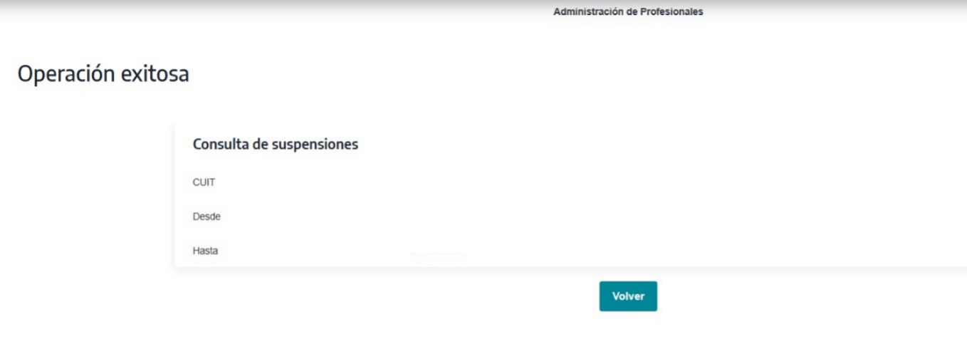 Verás una pantalla con los datos de la suspensión activa para el Profesional ingresado. 24/02/2026